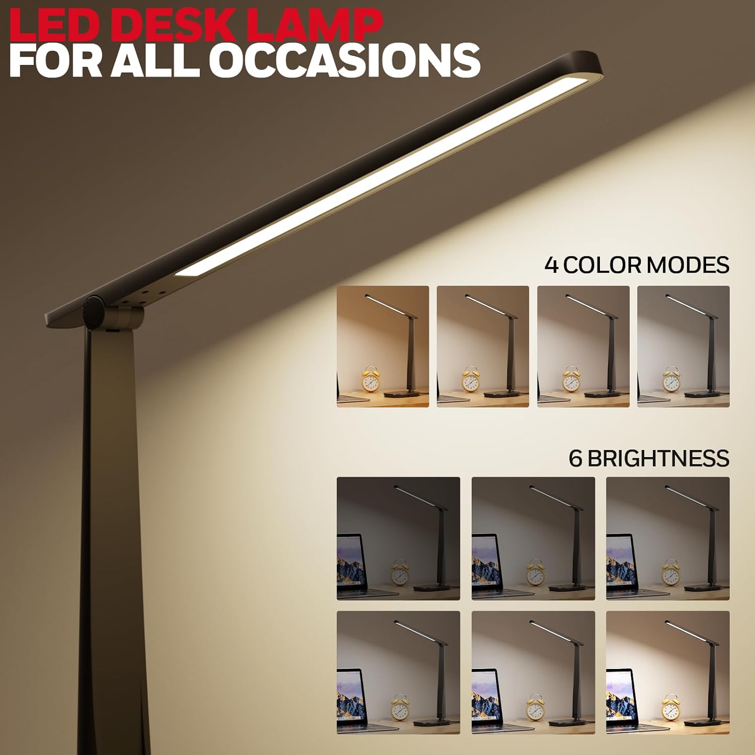 Honeywell LED Desk Lamp for Home Office, Dimmable & 4 Color Modes, USB A+C Dual Charging, Eye-Caring LED Light with Timer, Black