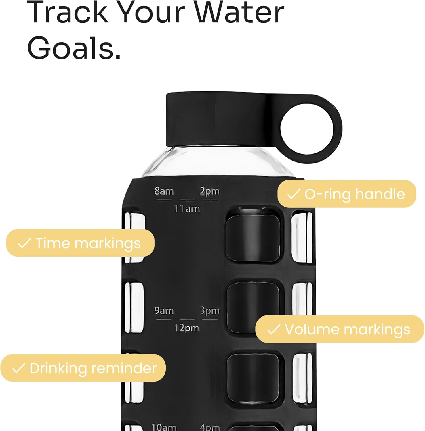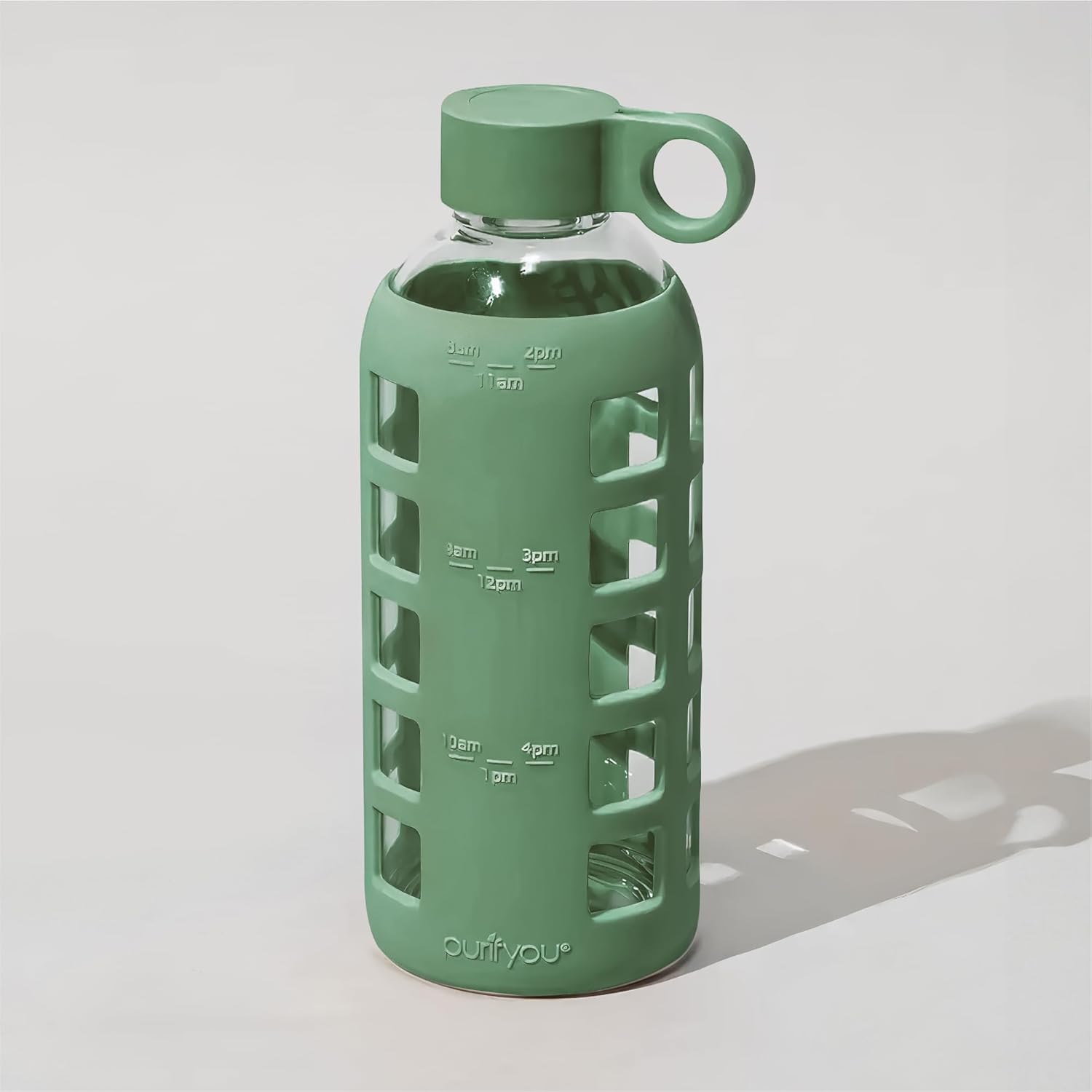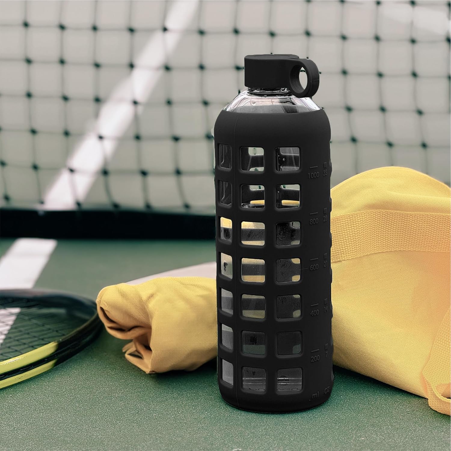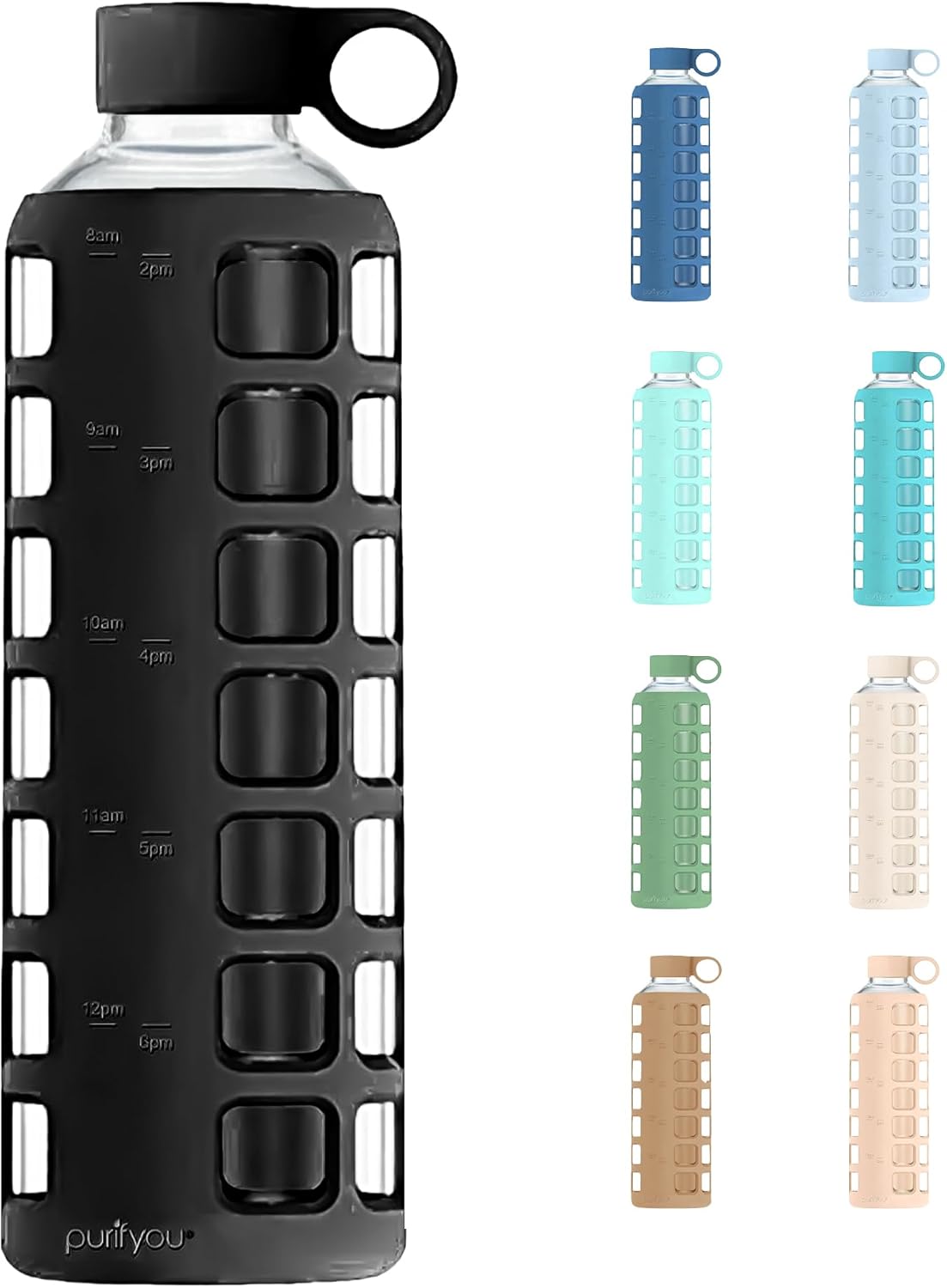 purifyou 40oz / 32oz / 22oz / 12oz Borosilicate Glass Water Bottle with Time & Volume Markers, Silicone Sleeve, Stainless Steel Lid | Reusable Glass Bottle for Water & Juice (40oz Jet Black)