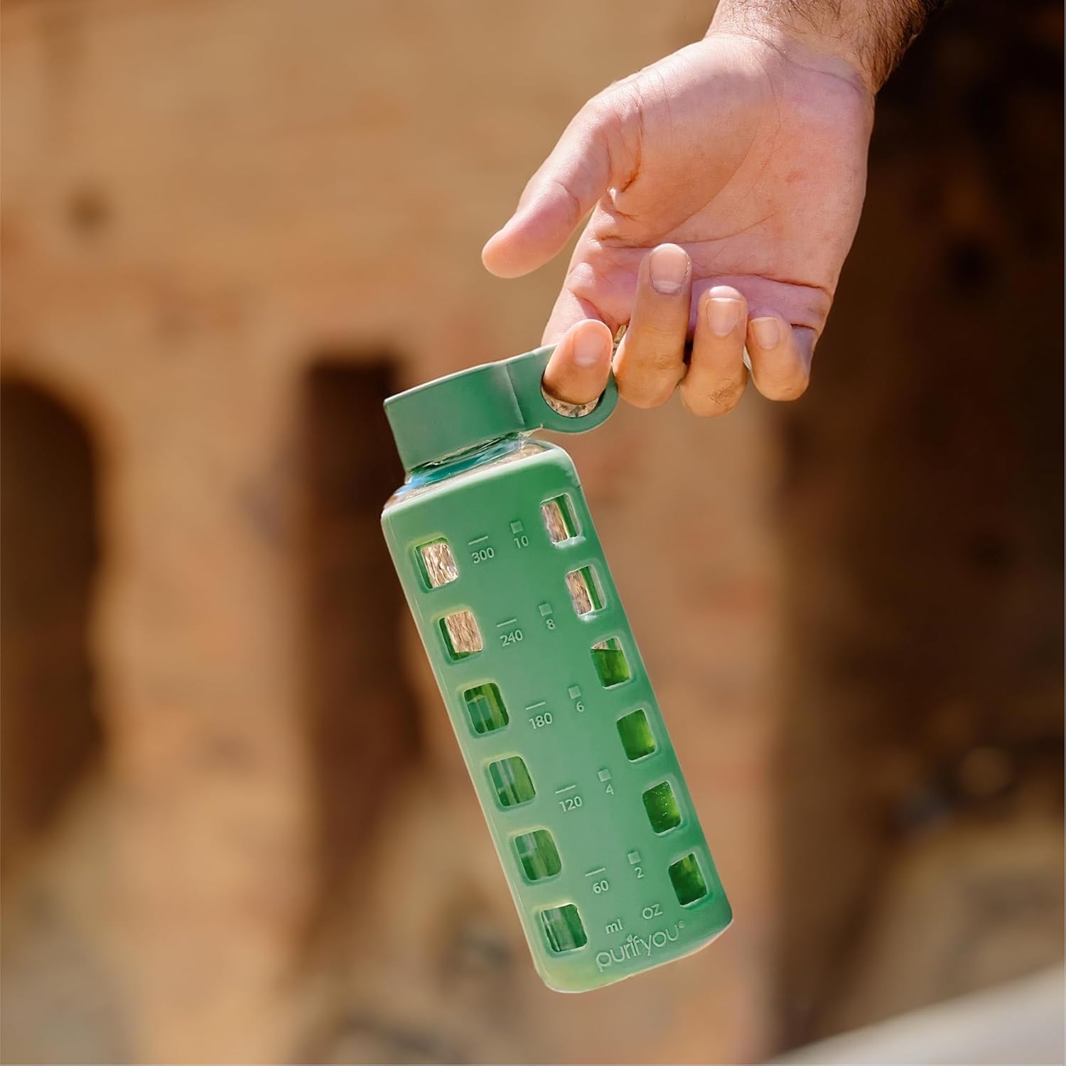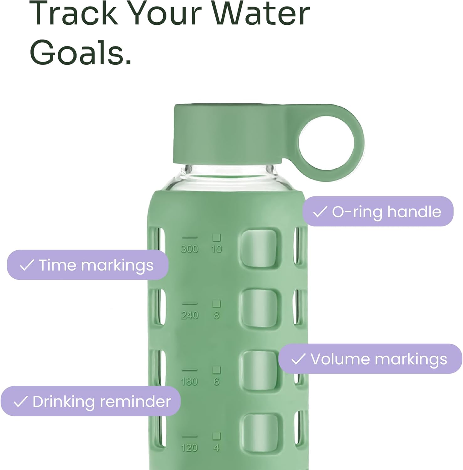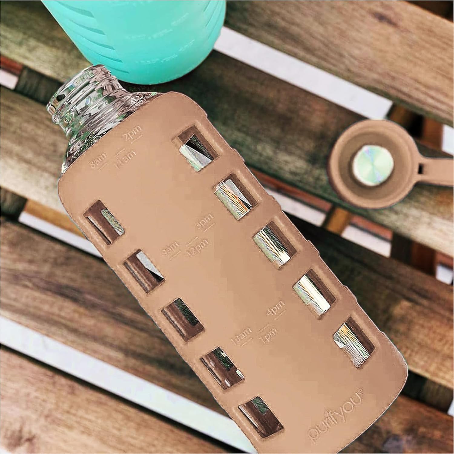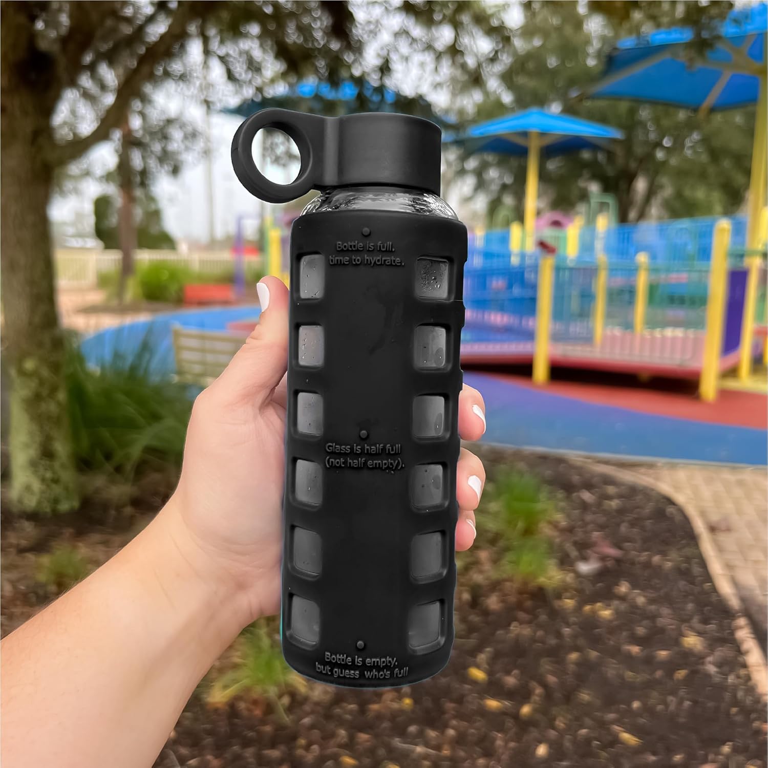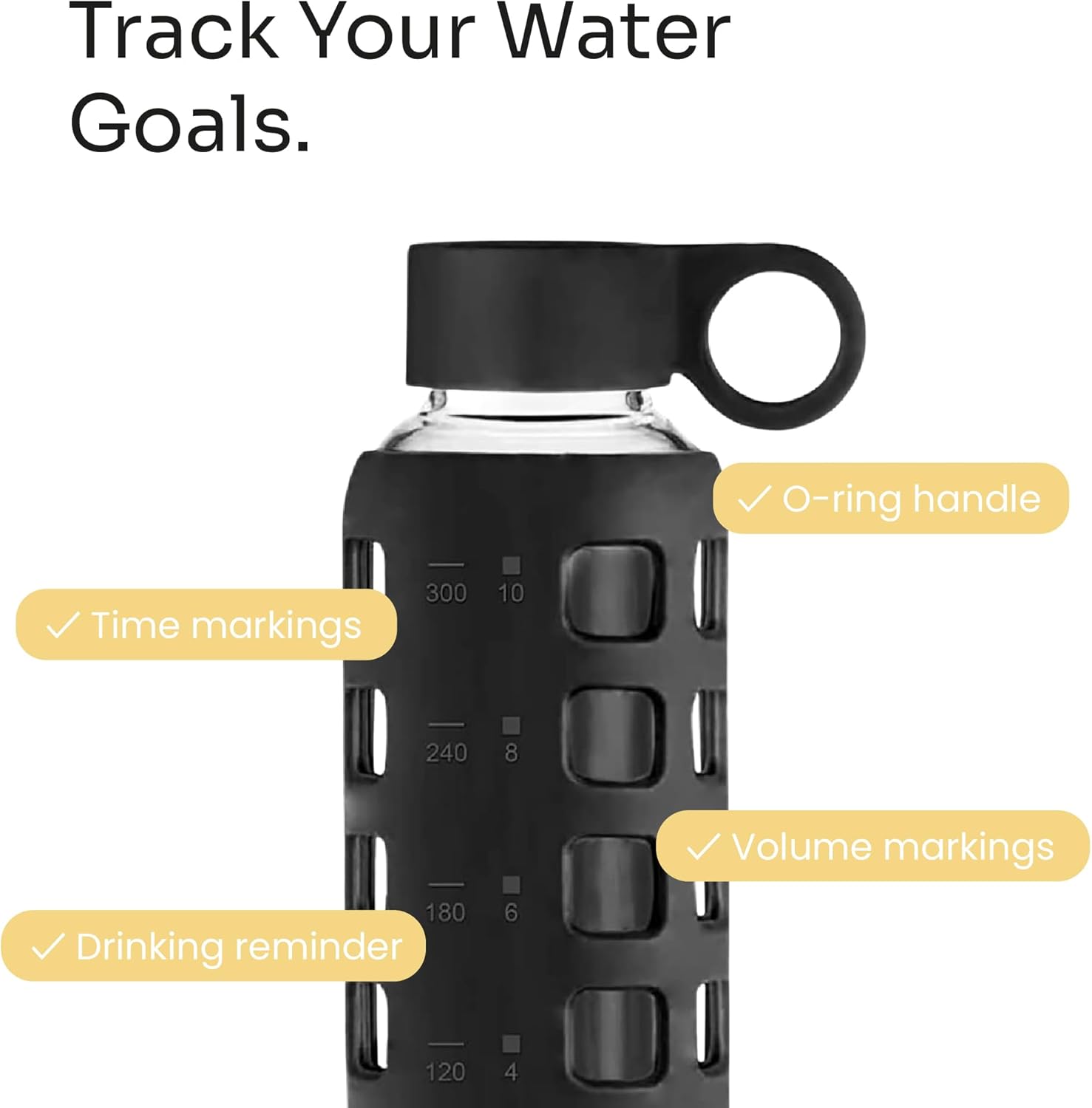 purifyou 40oz / 32oz / 22oz / 12oz Borosilicate Glass Water Bottle with Time & Volume Markers, Silicone Sleeve, Stainless Steel Lid | Reusable Glass Bottle for Water & Juice (40oz Jet Black)