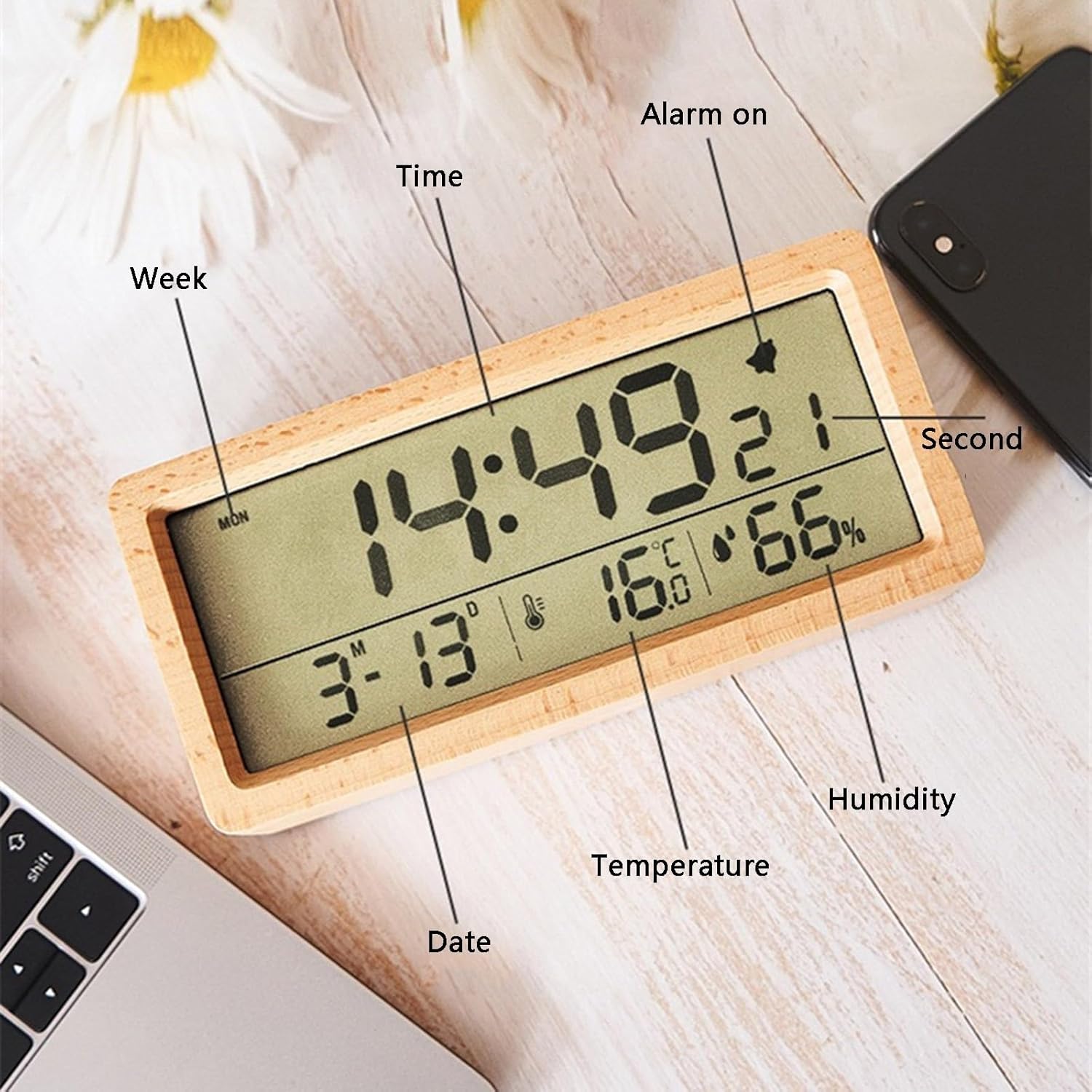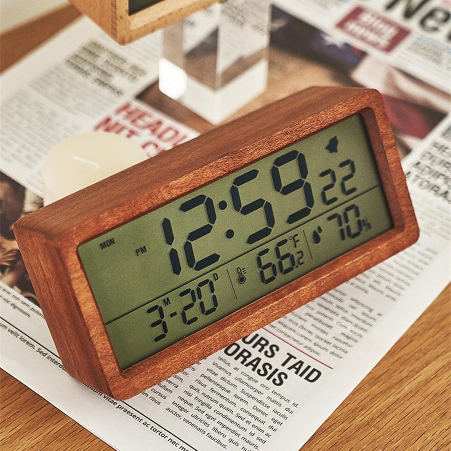 Wooden Alarm Clock, Battery Operated LCD Digital Clock with Smart Sensor Night Light and Snooze Function, Suitable for Bedroom, Bedside, Desk (Color : B)