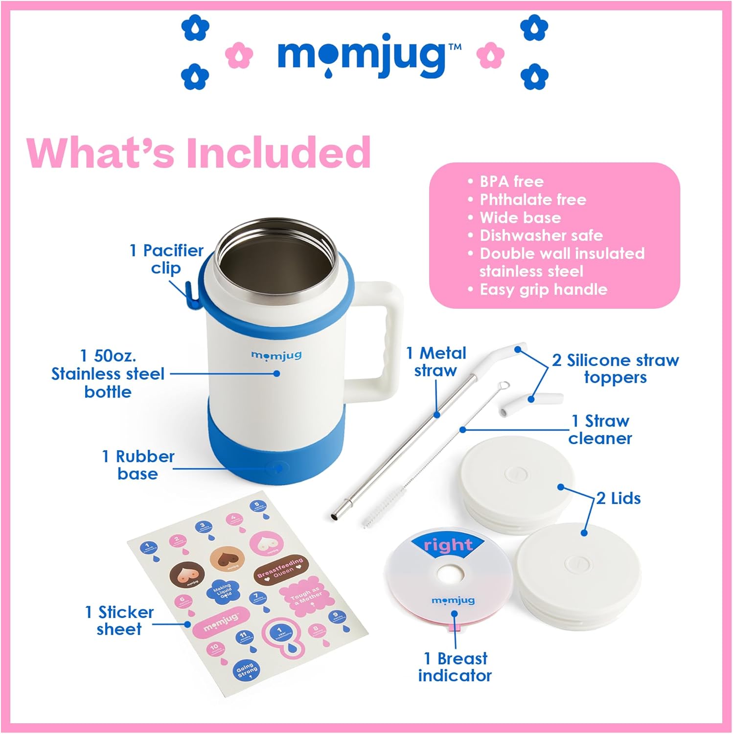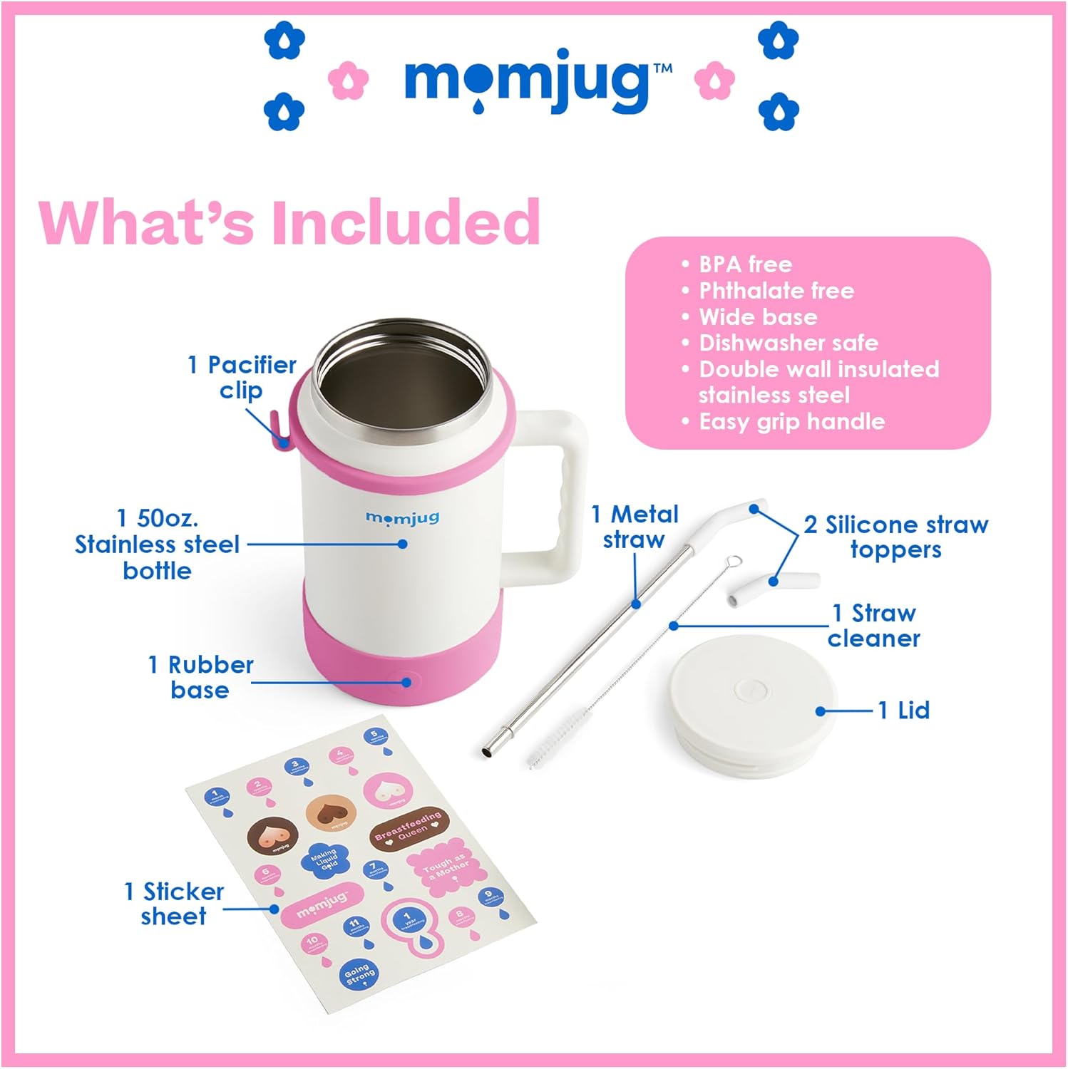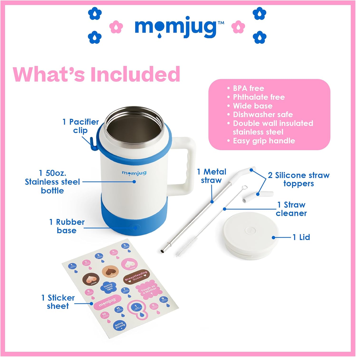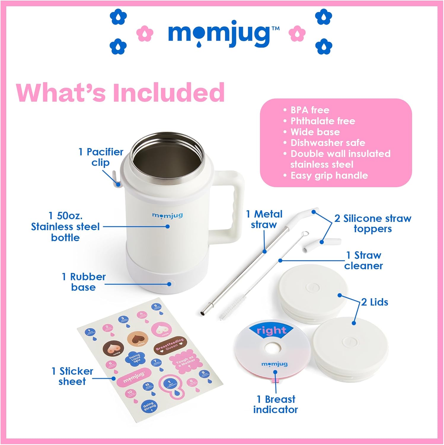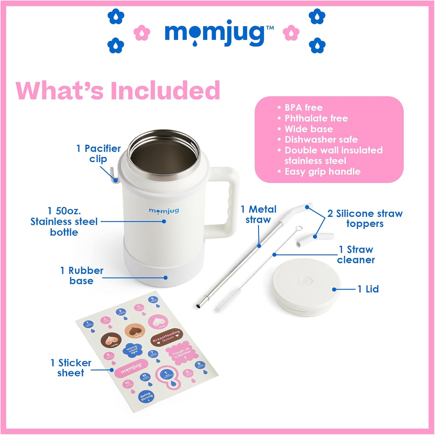 Hydration Water Bottle for Moms 50oz (Without Indicator, White)