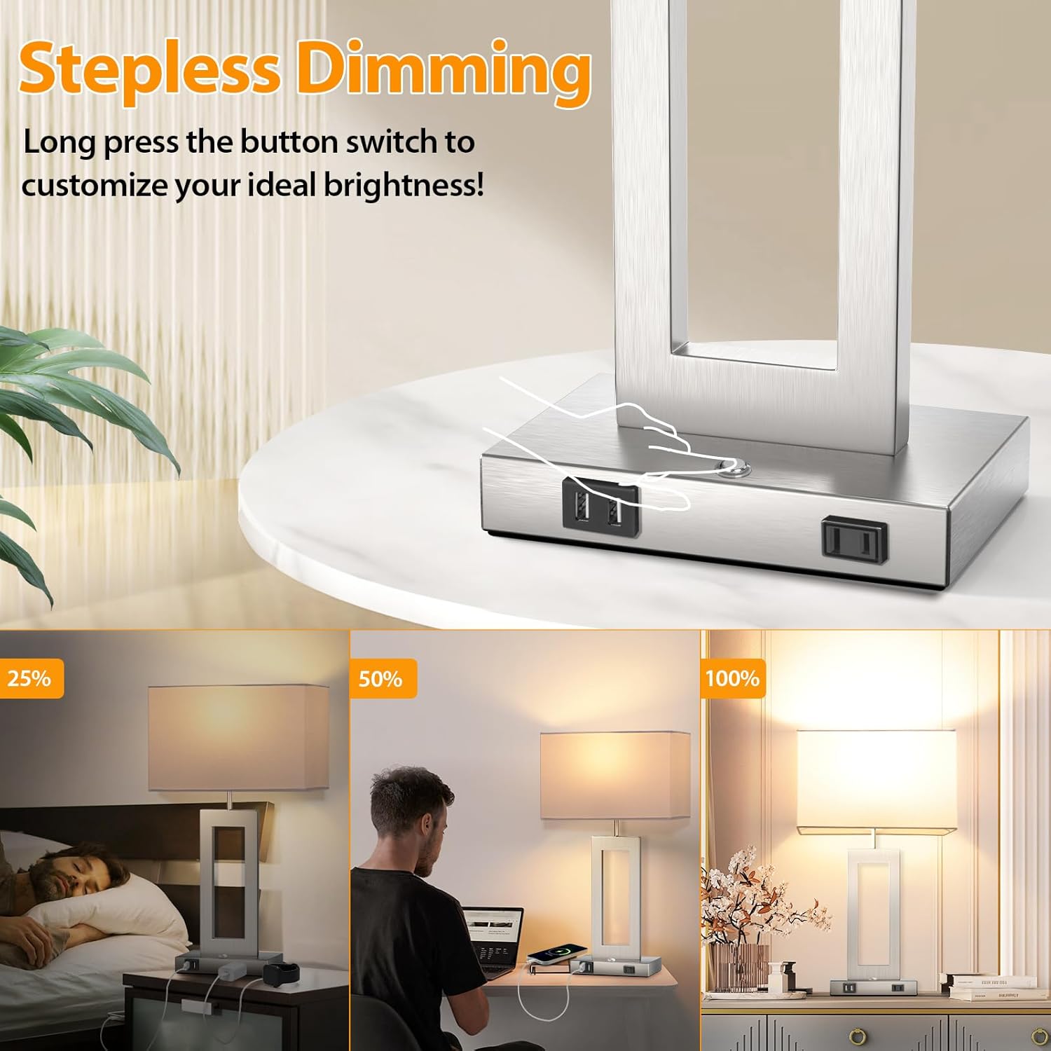 γπ¨π ππππππ 5%-100% πΊπππππππ π«ππππππγNot only limited to 3-level brightness, our modern touch control table lamps can be freely dim from 5%-100% by long press the button on base! This set of 2 dimmable table lamps provide multiple lighting effects to meet all kinds of occasions for no matter home or office. No more steps to reach a troublesome wall plug to control your outdated lamps